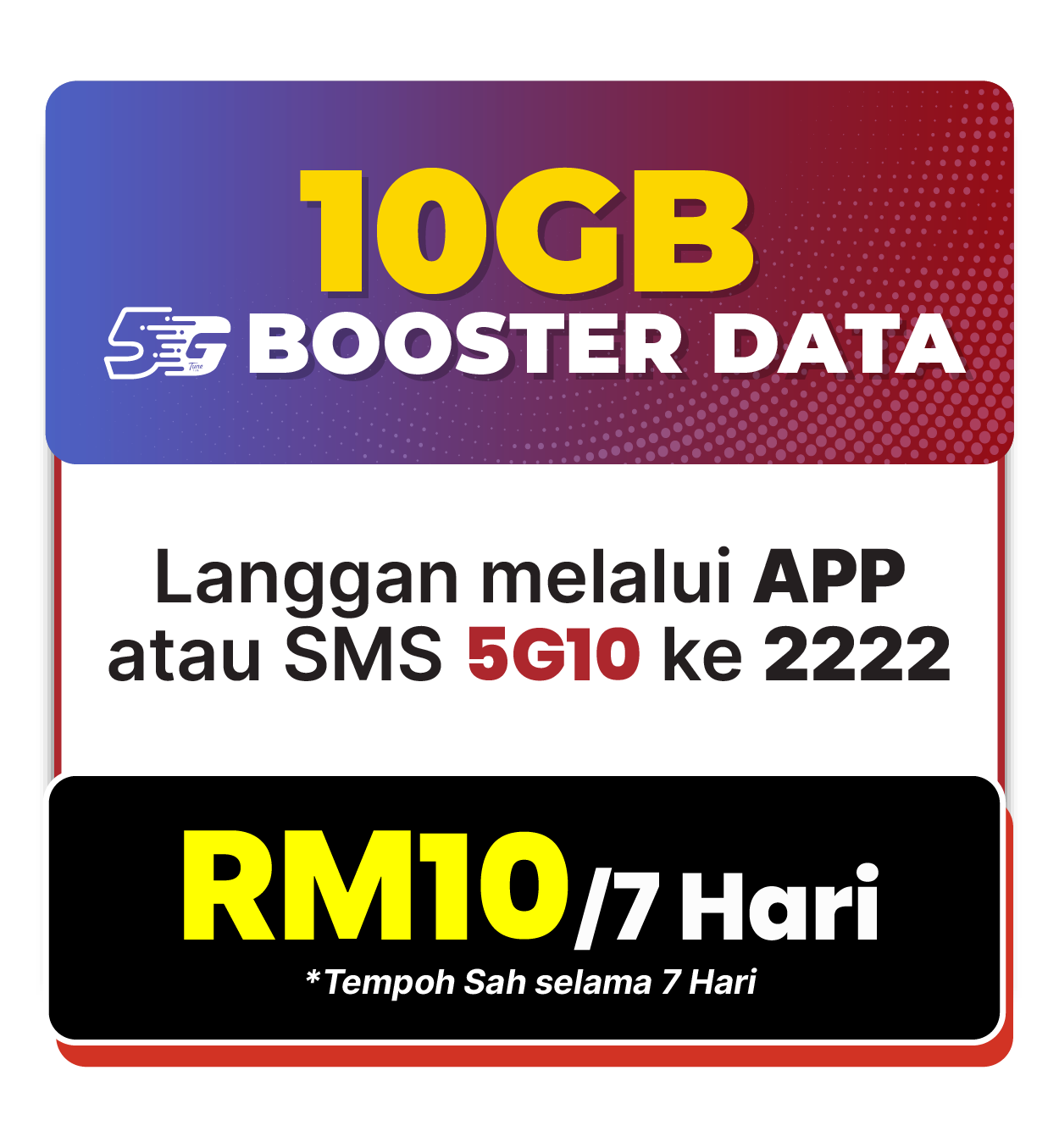 - . EB5G10 shall be priced at RM10.00 and shall include a 10GB 5G hotspotable Internet. SIM shall be provisioned with 5G service.
