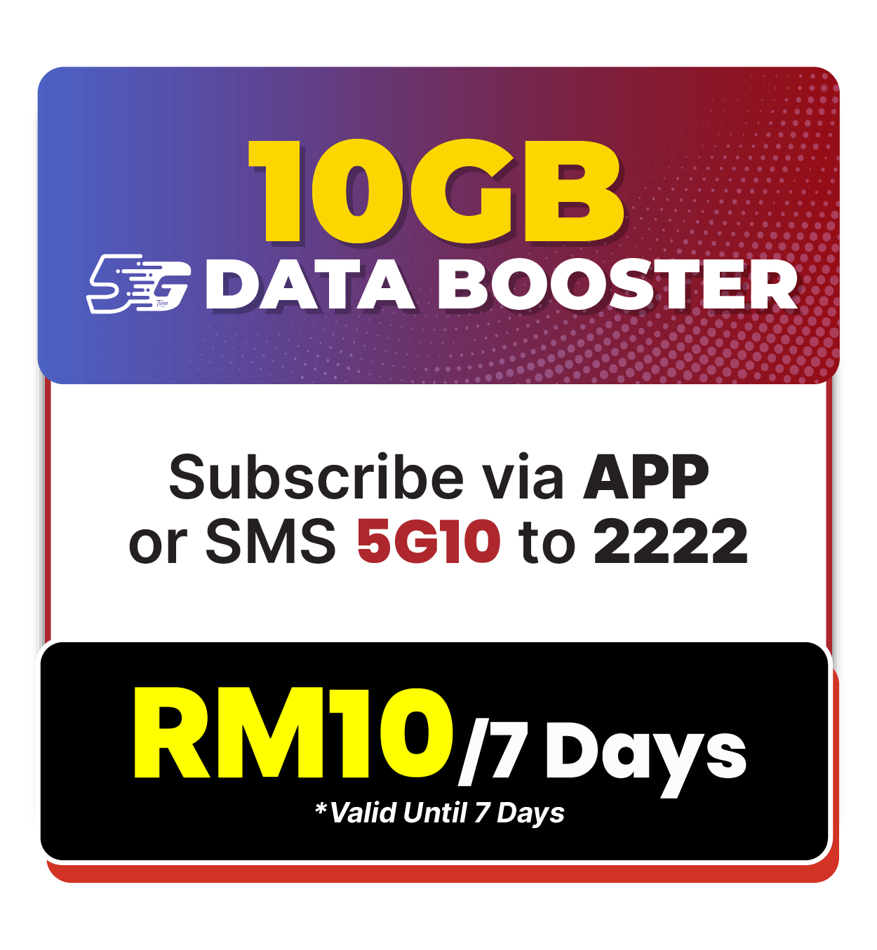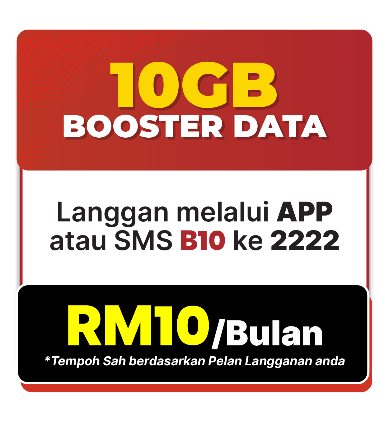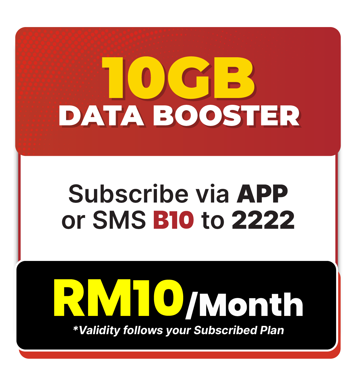 - . B10 is priced at RM10.00 and shall include a 10GB Hi-Speed Internet.
