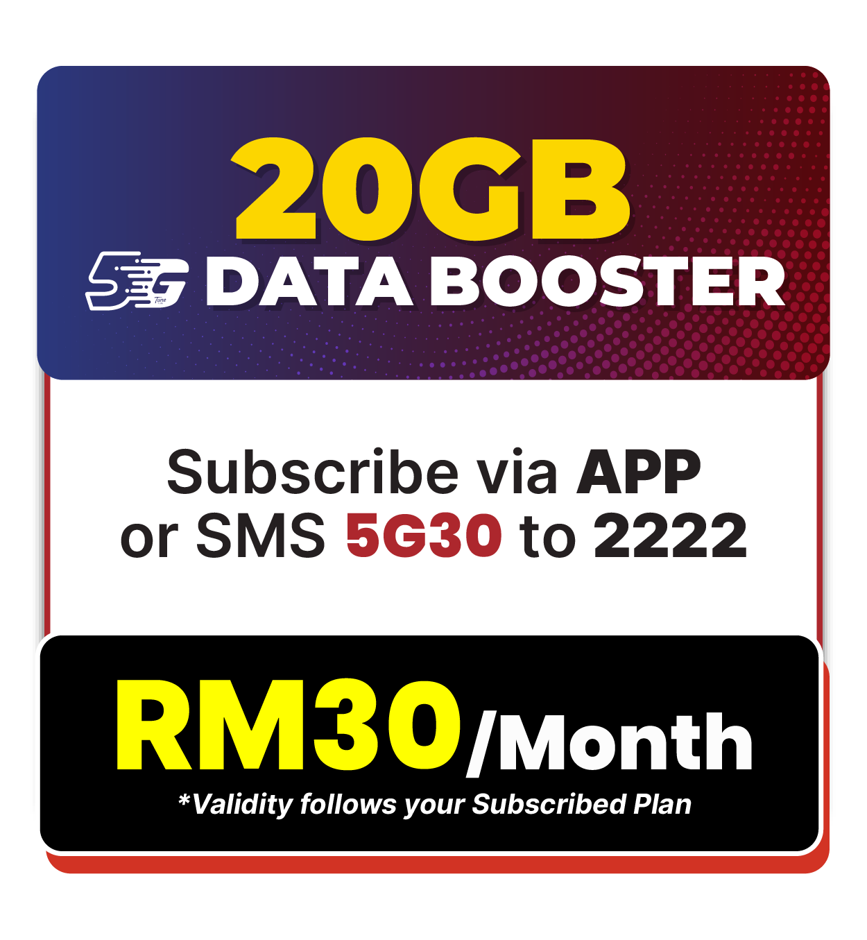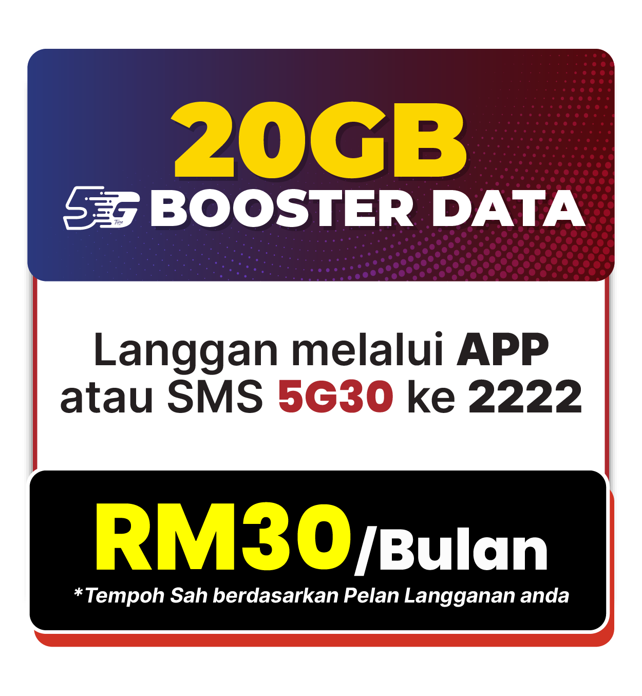 - . EB5G30 shall be priced at RM30.00 and shall include a 20GB 5G hotspotable Internet. SIM shall be provisioned with 5G service.