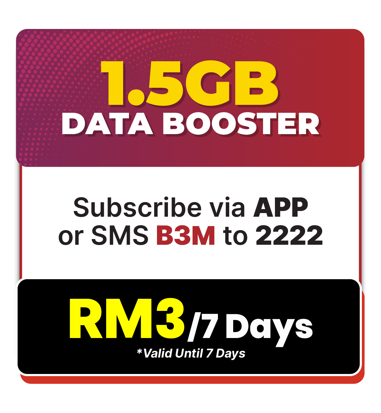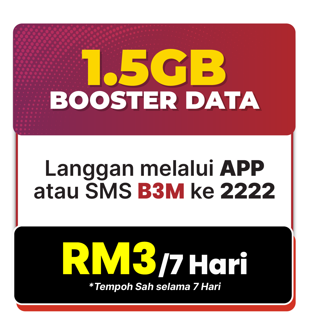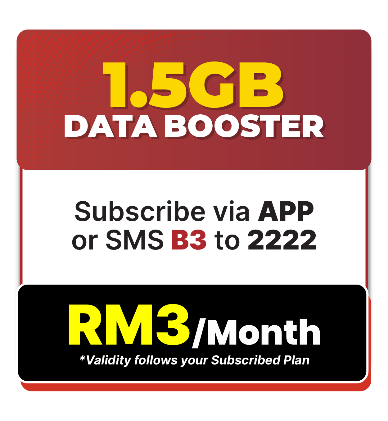 - i. B3 shall be priced at RM3.00 and include 1.5GB Hi-Speed Internet.